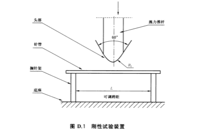 D.2.1刚性试验仪器 能通过施力推杆将最大至60 N(精度为士0.01 N)的力,向下垂直作用在针管上施力推杆的下端是由一个互成60"夹角的楔形和曲率半径为1 mm的圆柱面组成.其推杆宽度至少5 mm.图D.1例示出适用的仪器。