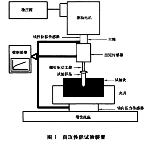 4.1自攻力。首先,将带有预钻孔的试验块刚性固定在试验块夹具上,如图1所示。选择合适的螺钉驱动工装(工装)并将其连接到主轴中,并检验导向孔和工装的对中性。然后,将试验样品组装(装载)在工装上。后,降低主轴直至使组装后的试验样品到达导向孔,通过调整主轴的轴向位移使得大预载荷为1.0N以保证螺钉和工装的紧密契合。