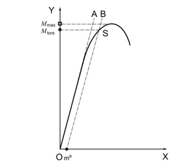 5.5.3 在转矩与旋转角曲线上,定位点m,对应旋转角的2度,并画一条线mB,平行于线OA。定位一个点S,这是mB与转矩和旋转角度曲线的交点。扭矩,Mtors,是定义为扭转屈服强度。